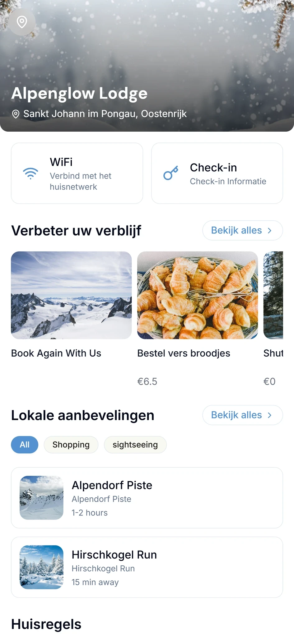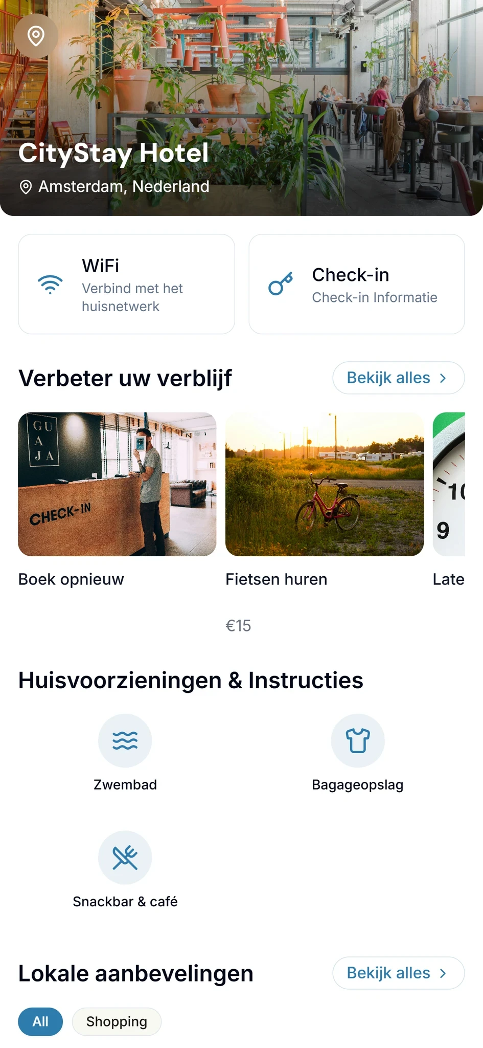 Maak het verblijf van je gasten moeiteloos. Van check-in tot lokale tips en extra services — alles wat ze nodig hebben is direct beschikbaar in één overzichtelijke app